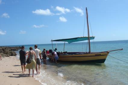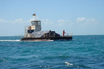 Early on Sunday morning, I hopped onto the bike and rode the short distance to Dave’s place to meet the other eight people who would be my shipmates for the day… There were five Portuguese girls from Johannesburg, a Dutch couple who worked on contract in South Africa and a South African couple on leave… We were fitted for masks, booties and fins, and then walked down to the beach a few hundred metres away, to the waiting dhow… There were three crew members, consisting of an interpreter-cum-guide, a cook and the skipper… Near the stern of the dhow was a large sandbox, which served as the “kitchen”… An old metal kettle was set to boil on a bed of hot coals, and before long, a morning cup of coffee was served to all on board… I sat watching the people around me, wondering what they thought of all this… The Dutch couple seemed intrigued by the fact that a fire was burning on board a wooden sailboat! The Portuguese girls spent the hour long trip across the bay to the island, chatting to the crew and enquiring about the lunch menu… The rest of us made ourselves as comfortable as we could on the wooden benches bolted to the gunwales, and enjoyed the views from where we reclined. A small ferry which serves the islands, passed us on its way back to the harbour at Vilanculos, the crew waving merrily as it cruised by…