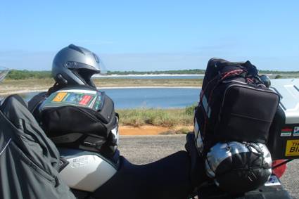 I passed the turnoff to Zavora and motored through Inharrime on my way to Quissico, a small town on the edge of a large fresh water lake, separated from the sea by a narrow spit of land… This is a beautiful area, but a large thundercloud had settled over the town just before my arrival, and greeted my entrance with a cloudburst… I frantically looked for shelter, and found it under the roof of a Galp Petrol Station… The petrol attendants, who were dashing for the safety of their little office, changed their minds when I skidded under the roof, close to the pumps, and gathered around to ask me the usual 20 to 40 questions… We chatted for about 15 minutes while rain lashed the area, and then as the cloud moved on and out over the lake, I put my helmet back on (it was still keeping my head together after the chilli-sauce!) and left to ride the 130kms to Xai-Xai…