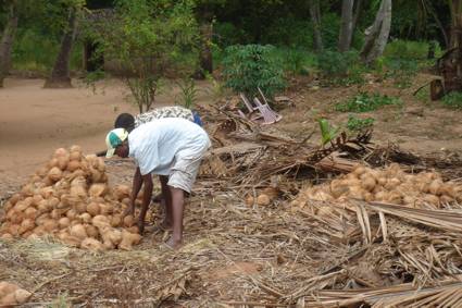 From the very outskirts of Massinga, an unbroken plantation of coconut trees stretched south for over 225km!! In places the plantations covered low hills all the way to the horizon on either side of the road… Many of the little settlements I passed were involved in the harvesting and preparation for transport of the fruit… I stopped and watched them for a while, sorting through the piles of coconut, rejecting some while piling others into the aforementioned pyramids, and then covering them with branches from the coconut tree itself. An elderly woman was deftly cleaving another pile of coconuts in half with a machete and setting them out to dry. I had seen truckloads of these “halves” being transported and assumed there was a factory of sorts in the vicinity which must be processing the flesh… Allan would have found it and arranged a tour… I on the other hand had business further south and after taking some film of the scene, I mounted up and headed for Maxixe…