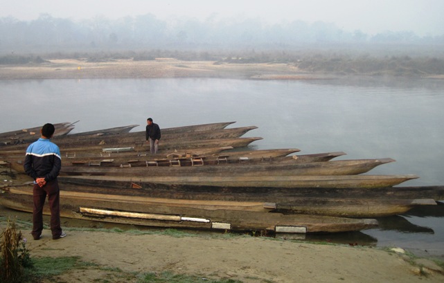After a quick breakfast, I hurried down to the banks of the Rapti River, where a large flotilla of dugout canoes were being readied to take groups of intrepid hikers, birders and other interested parties downstream… It was a little after 7.00am and mist obscured the open plains and grassland of Chitwan National Park, which lay on the southern bank… It rose in wispy tendrils off the warm water, making me think “Deep Purple”…
