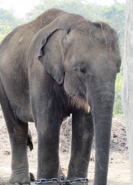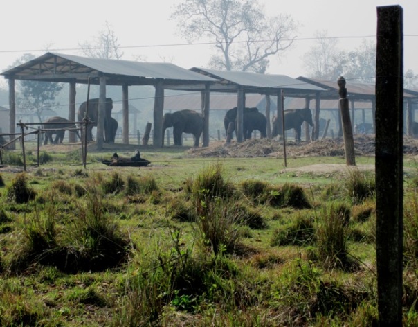 We walked out from under the canopy of trees and into a wide open glade where in the misty distance we could see open-sided sheds, under which small groups of elephants stood…