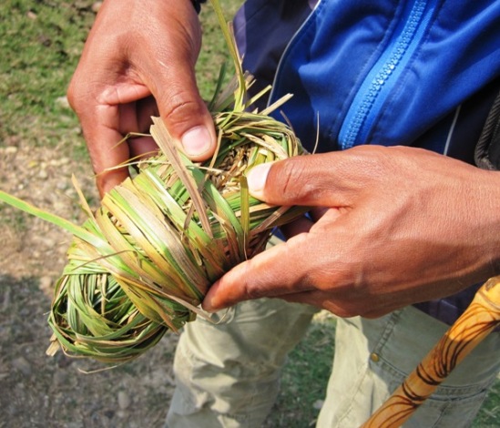 I spoke briefly to one of the mahouts, who was on his way to collect his elephant and take it out into the forest for grazing and training… He showed me the tightly rolled bundles of bamboo leaves, wrapped around rice and a sticky molasses-like substance, that they use to reward their charges with…