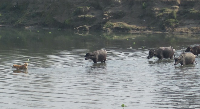 We left the elephant centre and walked down to a wide river, where a large dog was leading a heed of cattle through the water… I watched in amazement as he got to deeper water and began swimming, the cattle following him… When he got to the other side, he shook the water off his coat, and then stood as the cattle walked past him in single file… I almost fancied he was counting them…!! Satisfied that they had all got across safety, he trotted back to the front on the line and led them away into the forest… There was not a herder in sight, the dog seemingly in charge of the herd…!! Absolutely amazing….!!