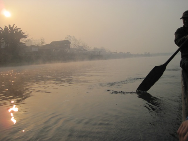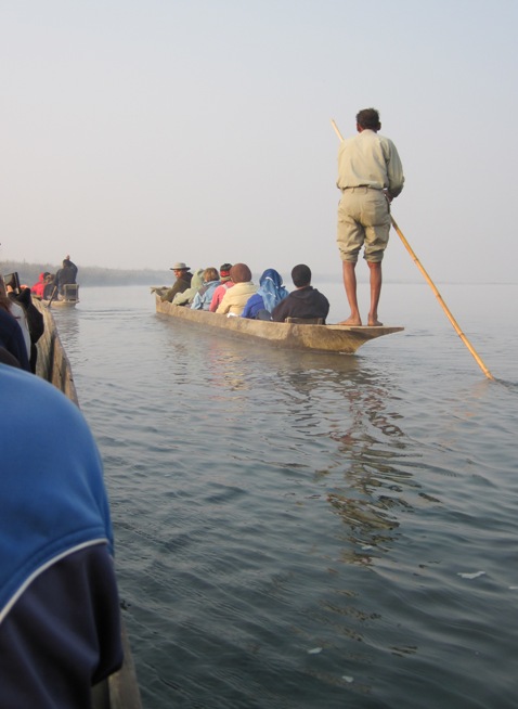The village of Sauraha slid silently by as the sun came out, burning away the mist… I dipped my hands in the warm water on either side of the dugout, trailing them and collecting bits of floating vegetation that we passed by…
