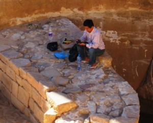 We stopped for lunch up against the steep sides of a mountain ridge, where a small dam wall had been built to hold water that accumulated in a narrow canyon… We unpacked our meagre supplies and shared our fruit, while Mohamed went in search of a quiet spot to perform his ablutions…