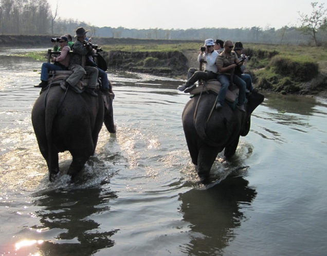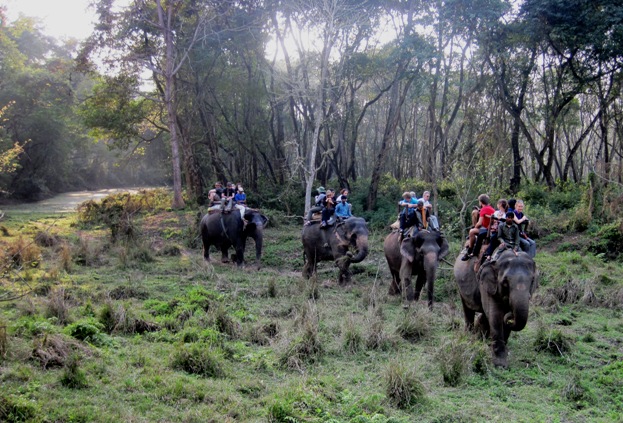 "All aboard...!! Elephant safari into Chitwan National Park...!! Last Elephant leaves in five minutes...!!"