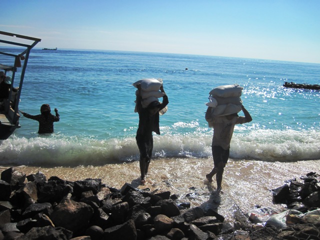 For the most part we were alone, and walked along remarking on the things we saw and marveling at the beauty along the shoreline… We watched a small boat offloading building materials directly onto the beach, bags of sand carried on the shoulders of the guys as they waded through the shallows…