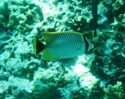 When Patti decided she had had enough, I escorted her back to the beach, and then went back out again, spending time watching a pair of Clown Fish protecting “their” Anenome, then finding a small school of Butterfly Fish and following them as they jinked in and out of the coral heads…