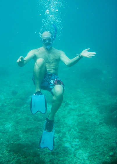 We agreed to a reasonable fee that would give us at least two hours of snorkeling at three different sites, and set off across the bay and around the distant headland to the north of the harbour… Our skipper tied his boat up to a small buoy that floated a few hundred metres offshore, and indicated with a few grunts that we had arrived at the first spot we could snorkel at…