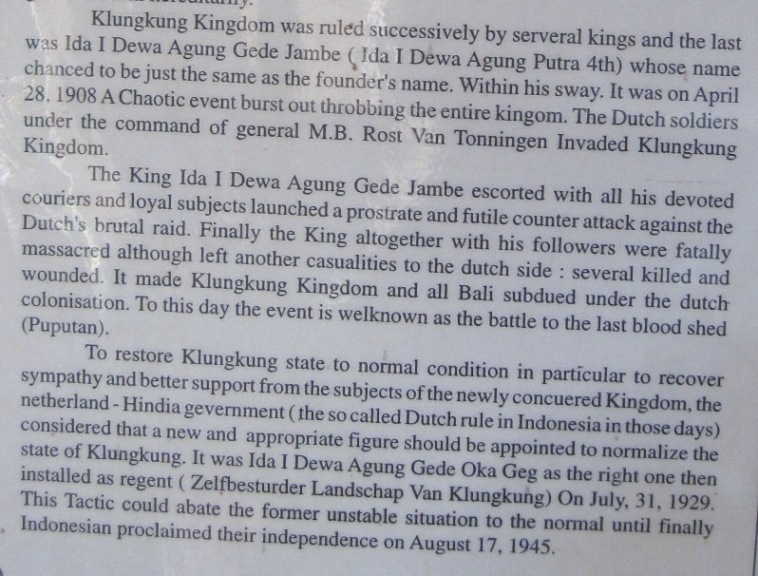 Besides a number of shrines where the ubiquitous daily offering are presented, there is also a large museum in the grounds and many of the exhibits brought more than just a smile to our faces… The information sheet describing the battle between the Dutch and the Klungkung Kingdom was a case in point…