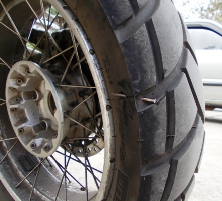 When I got there, one of the bus drivers pointed to my rear tyre and jabbered away in a mixture of dialects that I had no way of understanding… He then knelt down next to the Big Fella and pointed at a two inch nail embedded in my rear tyre…