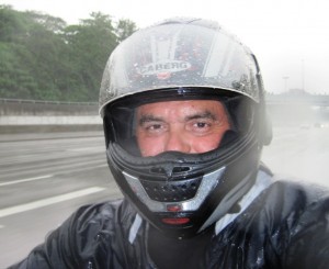 David had ordered lunch for us, and back in his showroom, a table and six chairs had been dragged together, where we sat eating while listening to rumbles of thunder that heralded heavy rain… The storm that lashed the city lasted for the next hour while we ate and eventually, we decided that we would have to ride through the rain in order to make our appointment with the photographer and editor of World Tour Rider magazine, who had arranged to meet us at the Radius Hotel for an interview…