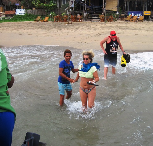 With a look that might have shriveled me up had I not been soaking wet, Chenty followed Phil off the boat… He had not bothered to use the steps, but threw himself into the waves, much to the surprise of the crew…!! He waded ashore, threw his dry-bag down, then gallantly waded back to the boat to help Chenty…
