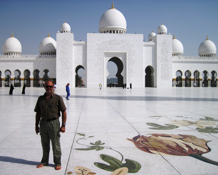 On Saturday morning, after a great breakfast prepared by Malcolm, we set off to see a few of the sights of Abu Dhabi… Our first stop was the Sheik Zayed Mosque, which I had glimpsed on my way into the city the afternoon before… I had thought it a pretty impressive structure from the highway that I zoomed past on, and on arrival at the mosque, had my first impression more than confirmed…!!