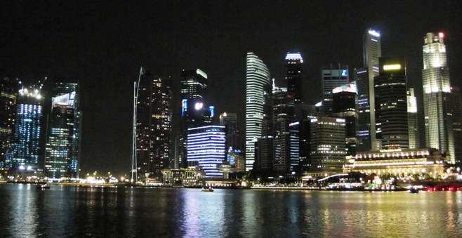 The lights of the city had begun flickering on as we walked and the downtown area was bathed in bright light and neon… It was an impressive sight, and we stopped on the edge of the Esplanade to take a few photos and drink in the sight…