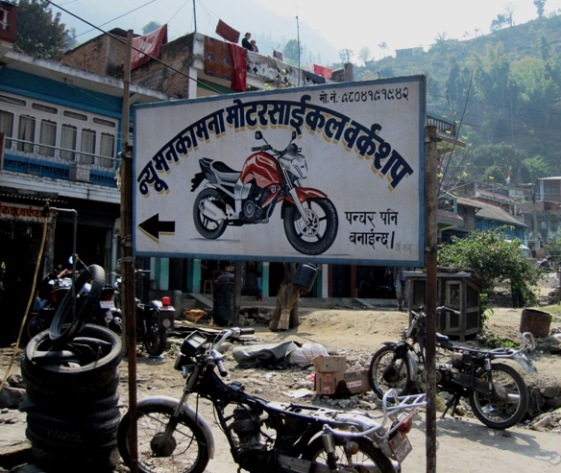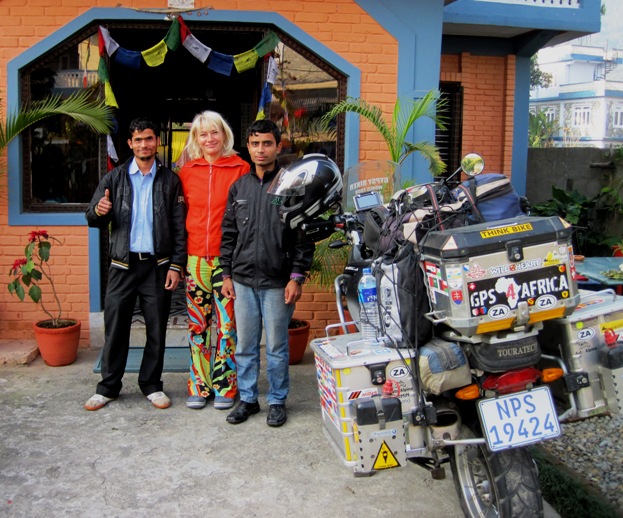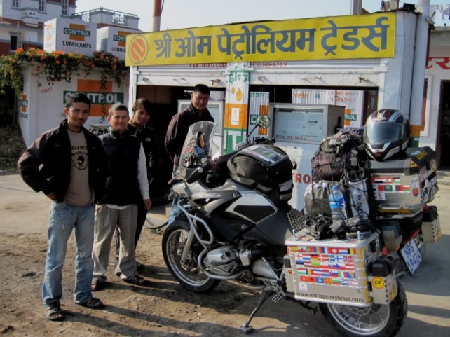 Early morning fuel stop just outside Pokhara. Mr. Jaha Bhattarai, the owner (white sleeves) was a friendly guy who wanted to know all about me and the Big Fella...