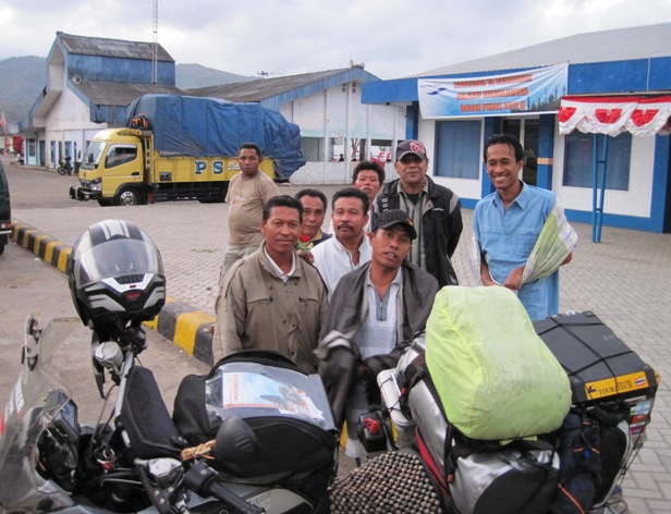 Just outside the harbour entrance, I stopped in a small parking area to wait for sunrise… I sat down at a small Warung, ordered the first of three cups of coffee and settled down to watch the goings-on around me… Before long, the bike and I were surrounded by people who wanted to know everything there was to know about us…!!