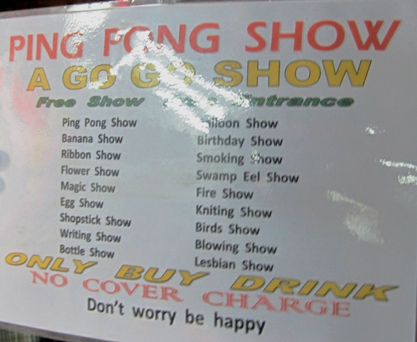 One thing that did get our attention, was the offer to go see a “Ping Pong Show”… This is where scantily clad girls play a brand of ping-pong that you will not see at the Olympic Games anytime soon…!!
