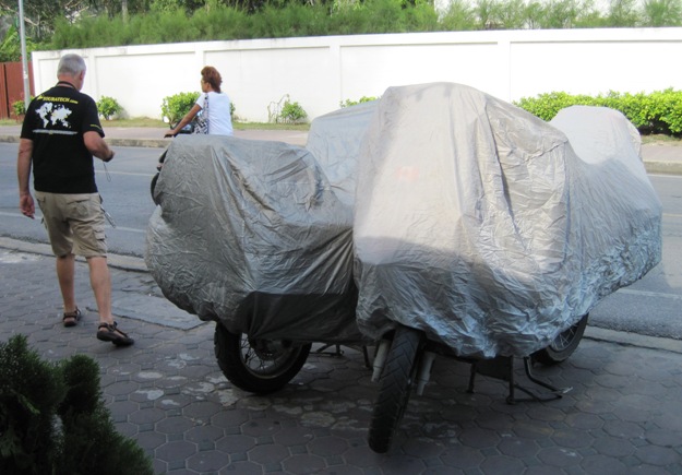 We got our bikes tucked up for the night, using our covers because they stood out in the main road, where hundreds of people walked by every day, and we all know what the devil does with idle hands…!!