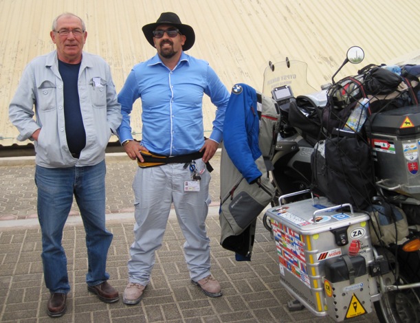 While I was strolling about, a pickup arrived and the two occupants came over to look at the Big Fella, who was a little down in the mouth at being left uncovered while I was gallivanting about in Bahrain and Qatar… It had rained while I was away, and the bike was filthy…!! This even though the Wrigley’s Ethiopian maid, Almaz, had given it a quick wipe while I was loading my kit…!!