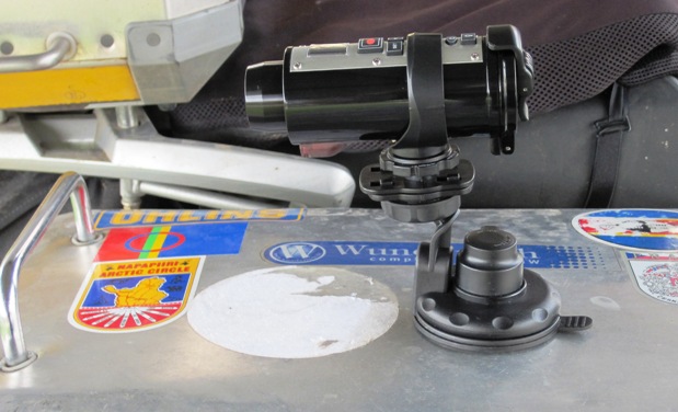 Rear facing camera... This one is fixed in position using a potent suction device, and can be mounted to either of the panniers, or the Top-Box... I think I have the filming side taped now...!!