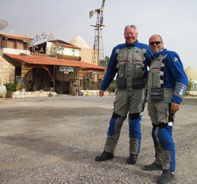 The Baghdad Café lies at the junction of roads that lead to Iraq, Damascus and Homs… It is a well known stopover and camping point for travelers riding through the desert… When we arrived, the place was deserted, but before long, a little pick-up truck came bumping across the gravel apron, and the owner did his best to entice us inside…