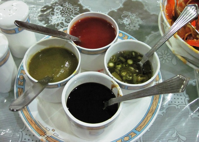 The green sauce on the left is an eye-watering, sphincter-loosening, chilli paste... After just a small sample, I made a mental note to check on my stock of Imodium when I got back to my room...