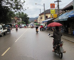 I kitted up in full rain gear, and left Luang Prabang in the middle of another rain squall… Perfect timing…!! I had to smile at the people on their scooters that rode around using umbrellas to keep their clothes dry…