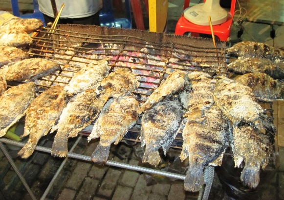 River fish cooked on the coals at a street vendor's stall... "I sink not" said Meier... "Better ve haf hamburgers instead, ja...??"