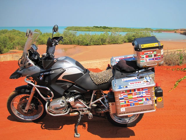 He had ridden the Gibb River road and on entering Broome, had seen the Big Fella parked at the info centre… We stood chatting about his ride, which he had taken two days to make, and discussed the possibility of riding up to Cape Leveque together the following day… But before he could do that, he needed to replace his back tyre, which was in a rather sorry state…!!