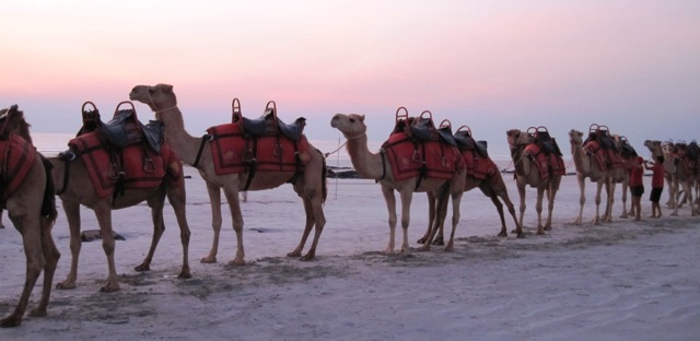 To the north of Cable beach, camel-back safaris take visitors on a long walk down the wide beach, and return to the parking area at sundown… About 60 camels, belonging to three separate companies, milled around on the edge of a rocky area that lies between the swimming beach and the edge of town…