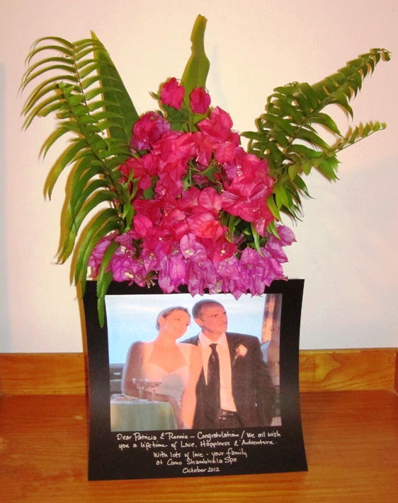 A large bunch of flowers picked from the hotel gardens was waiting for us when we arrived home, and with it a photo of us on our wedding day, with best wishes for our future together, written below it…