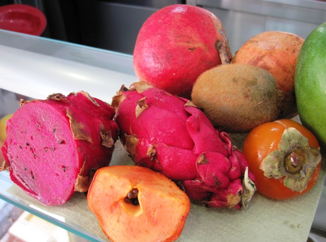Dragon Fruit, Red and White Pomegranate, Kiwi Fruit, and Persimmon... A heady mix for a fruit cocktail...!!