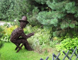 Woven from willow and reed, this fisherman patiently waits for the bite that will bring him to life...