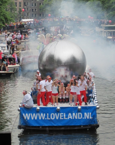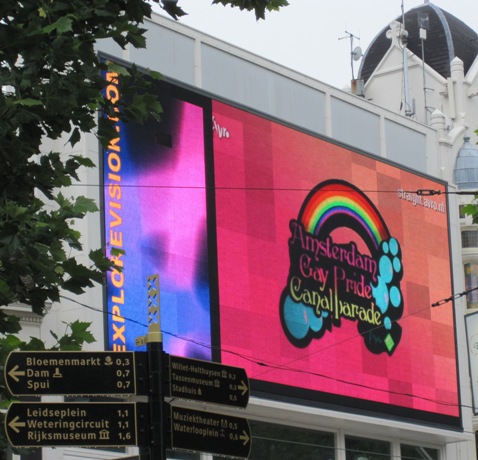 This massive electronic billboard left visitors in no doubt that the Gay Pride Parade was the happening event in Amsterdam...