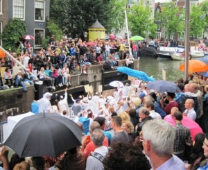 The canals were crowded with people waiting for the barges that would carry groups of the Gay Fraternity down their lengths on a pre-ordained route… Even the Major of Amsterdam was there…!! From a vantage point above one of the bridges, we watched as a few of the barges made their way down the canal, music blaring from the sound systems installed on each one of them…