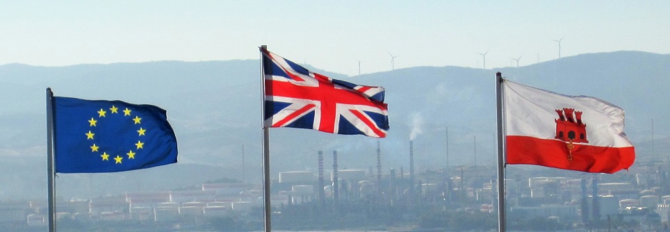 The flags of the European Union, Britain and Gibraltar from atop one of the military emplacements up on the Rock...