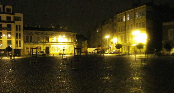 Chairs on the Square... These metal chairs are bolted in place on this wide square, to commemorate the time when local residents brought chairs for the Jews to sit on, while they waited to be transported to the death camps of Auschwitz...