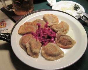 At a large restaurant, the Kompania Kuflowa, which held seating for hundreds of people, we enjoyed traditional Polish cuisine; Pierogi, with cabbage and mushrooms was ordered for me, while Wojciech went with the Polish sausage with onions…