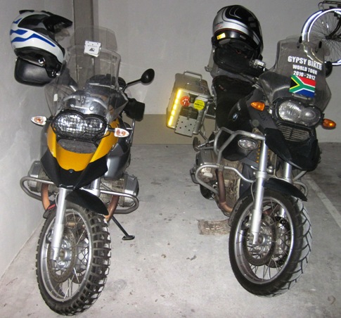 I looked to my right and saw a short flight of stairs leading up to a red door… I could not fault the GPS, that was for certain…!! We carried my kit into his apartment, and then took the bike a few blocks away to where Michel rents a garage, and parked it with his own GS1200… I was sure the bikes would have plenty to talk about over the next few days…!!