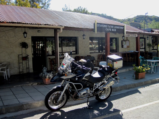 Back at the bike, the Big Fella reminded me that we had covered almost 380 km since he last had a “drink”, so in the tiny village of Plano Platres, we stopped to refuel… He got what he wanted, while I settled for a toasted sandwich and two cups of coffee…!!