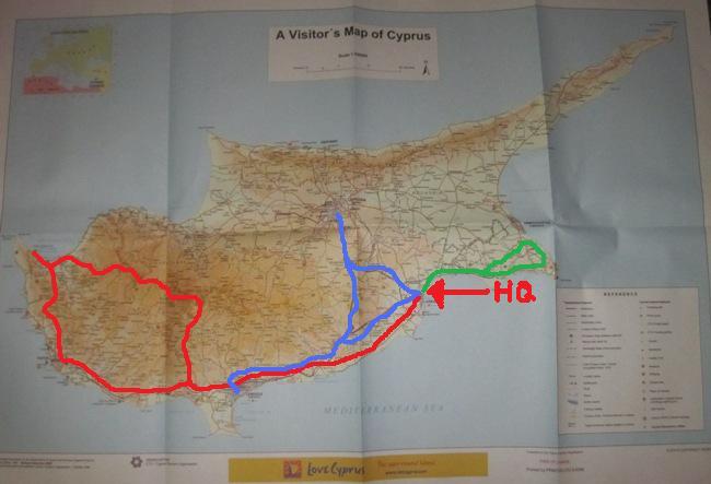I set myself the rather ambitious target of riding up into the highlands to visit Mt. Olympus, and then cut across to Polis on the Bay of Crysochou in the far west, before turning for the long run east through Pafos, Limassol and back to Larnaca… (HQ…!!)