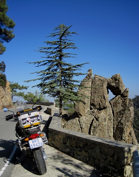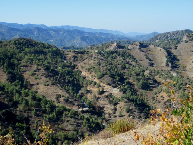 We left Kykkos and headed further east toward Stavros and Polis on the coast beyond that… Most of the road was covered in shade, and ran through forests of Mediterranean Pine… I passed a pair of logging trucks, filled to capacity, and clearly not expecting to encounter a big bike blasting towards them…!!