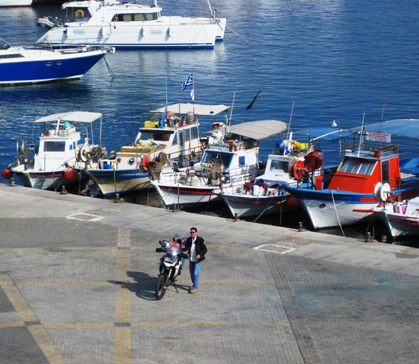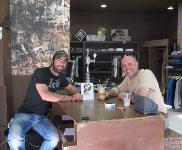 We parked next to a modern looking clothes outlet, and there I met Antonis Agas, an exuberant young man who was very keen to hear about my travels… He dashed across the road and came back with an ice cold Frappe for me, and a glass of water for Romos…