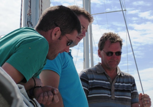 Charlie and Antonia went back to the mainland later that afternoon, and with the rest of the crew, I settled down to another liver-bashing session, which again saw us stagger aboard the boat in the small hours of the morning… I had no idea how I was going to cope with racing later that morning, but just as we were casting off, an American sailor asked if he could join us for the day and Borge agreed… We collected Alex and his son Joelyn from their yacht “Savage” which was moored out in the bay, and headed for the rest of the fleet that were far out on the eastern horizon, waiting for the committee boat to set the course for the day’s race…
