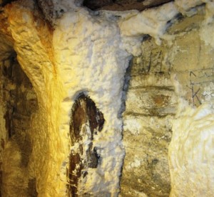 "Cauliflower-like" salt crystals have grown on this wooden pillar... The crystals form on the walls and ceilings of the mine...