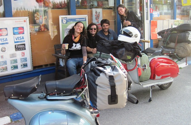 While I filled up, three Vespa Scooters chugged into the garage, and six young Italians dismounted from them… These three guys and their girlfriends had left Italy on the 1st of August, and were on their way to Nordkapp on their 50 year old Vespas…!!