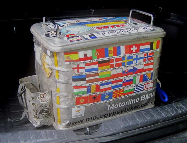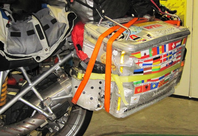 To this end, we went out and bought another packet of the largest cable ties we could find and used six of them on the left pannier and four on the right…