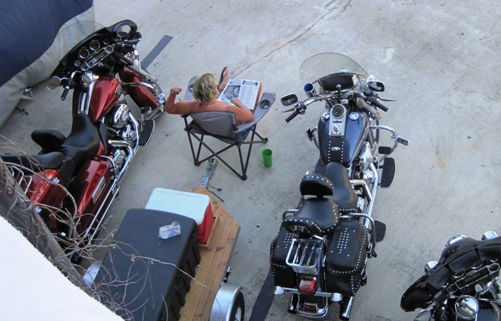 Downstairs from our room, a group of bikers set up camp and partied right there… Check out the home-made trailer and cooler box !!