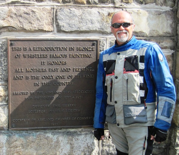 In Ashland, we stopped to walk around the Mother’s Memorial; a bronze reproduction of Whistlers famous painting, and dedicated to “All Mother’s Past and Present”… I was very appreciative that my friends had brought me here first. I spent a few minutes thinking of my mother back home, and the last, tearful few minutes, we spent together. I mumbled the promise that I had made to her before I left,’ that I would look after myself; ride safely and carefully; and last but by no means least,’ bring her daughter-in-law back to her as quickly as possible…